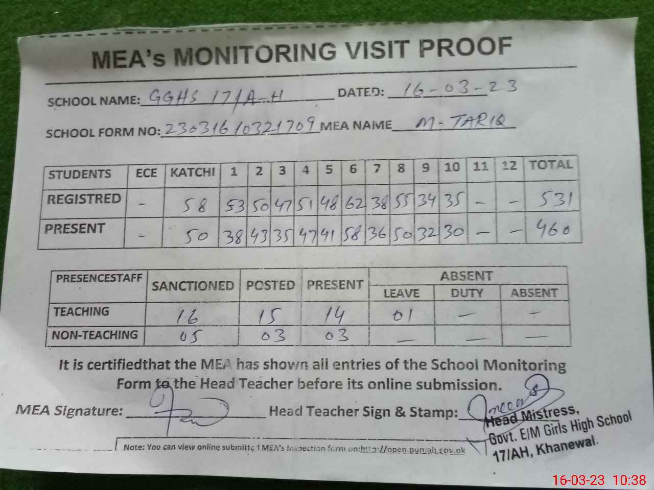 | EMIS Code: 36420107 | Name of School: GGHS 17/AH, KHANEWAL | |||