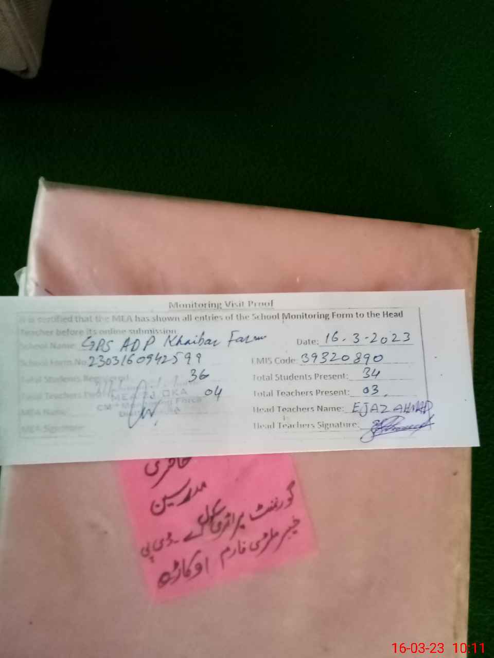 | EMIS Code: 39320890 | Name of School: GPS ADP KHYBER FARM | |||