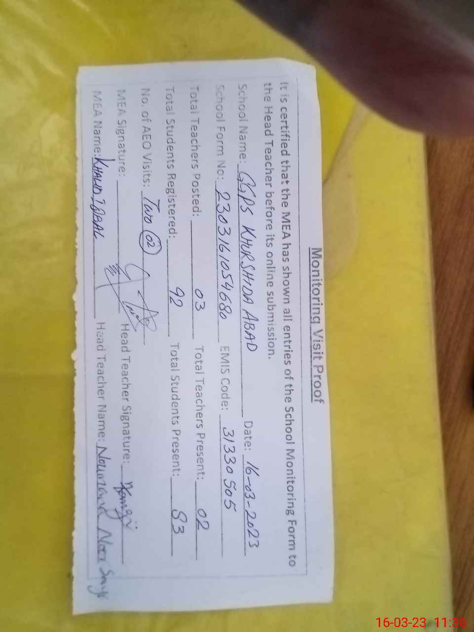 | Attendance Register | Head Teacher | MEA with School | Visit Proof |