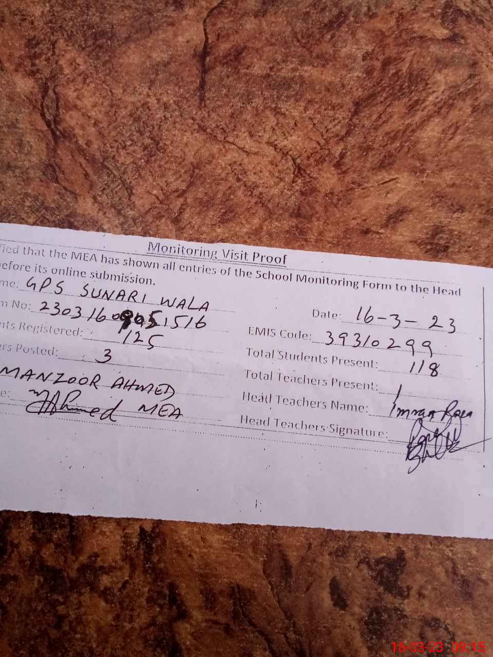 | EMIS Code: 39310299 | Name of School: GPS SUNARI WALA | |||