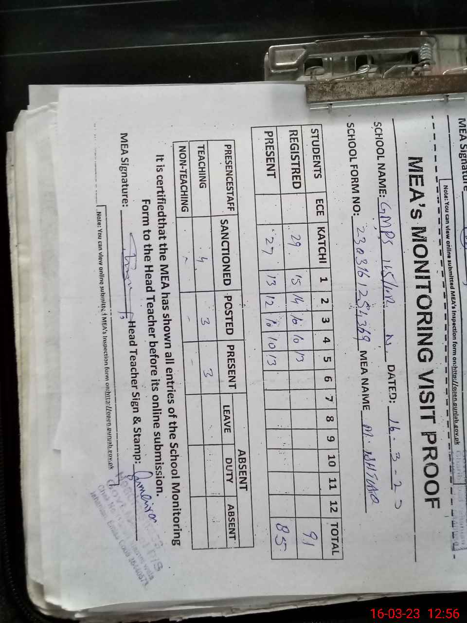 | Attendance Register | Head Teacher | MEA with School | Visit Proof |