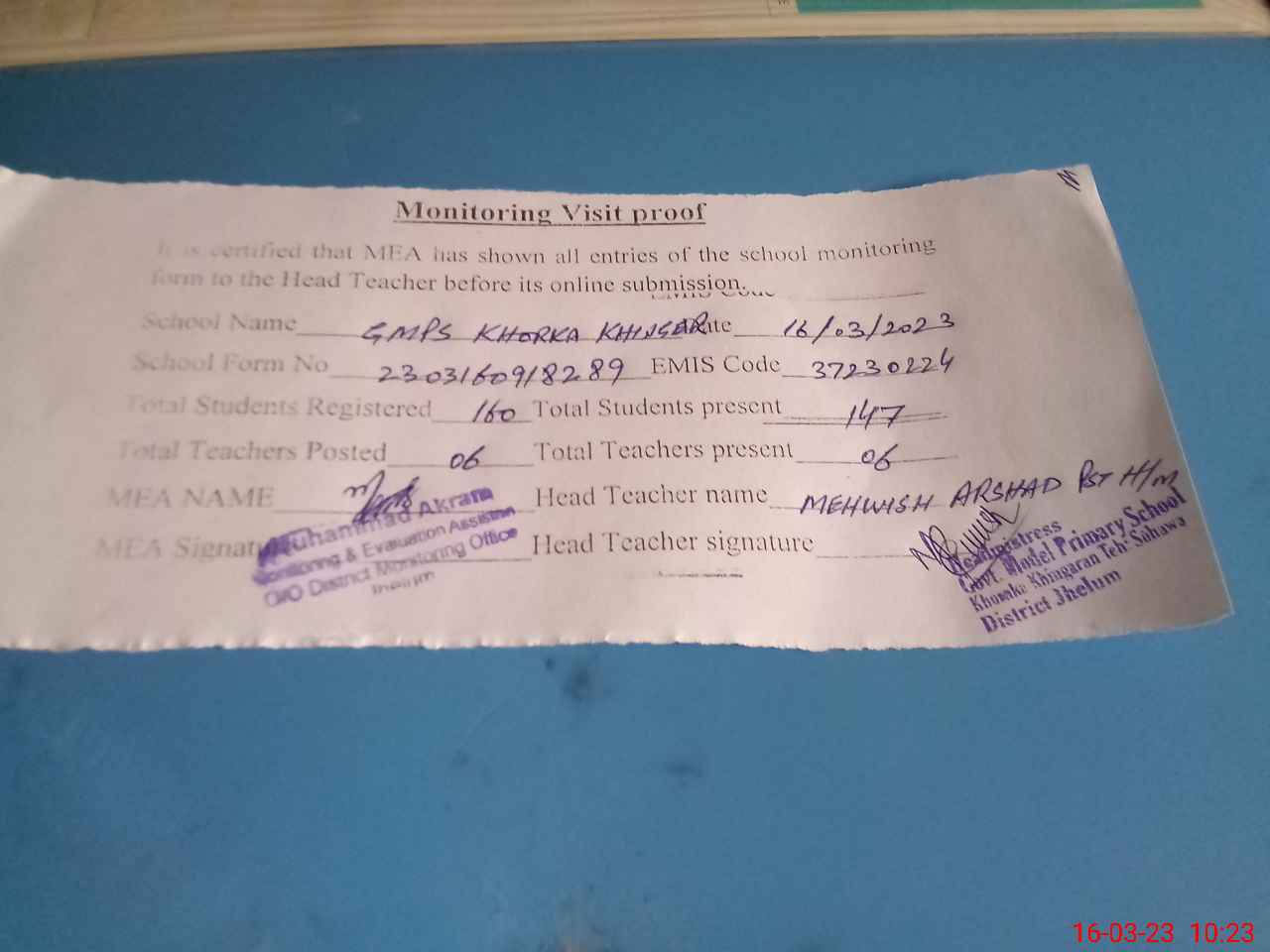 | Attendance Register | Head Teacher | MEA with School | Visit Proof |