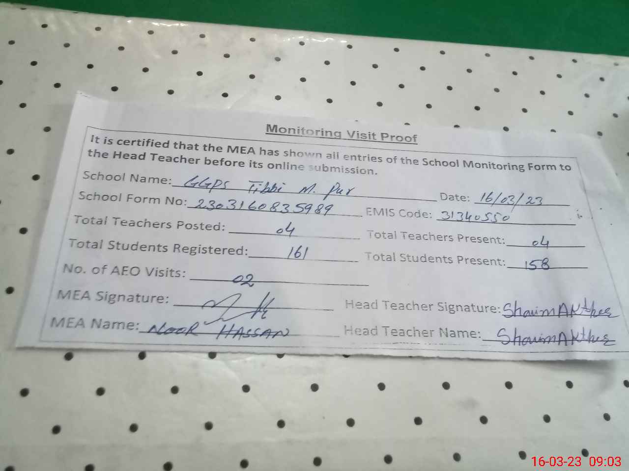 | Attendance Register | Head Teacher | MEA with School | Visit Proof |