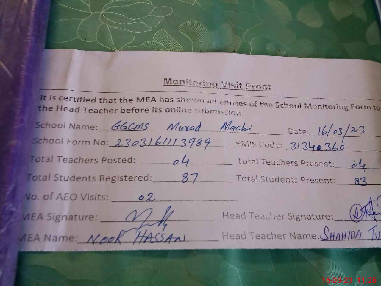| Attendance Register | Head Teacher | MEA with School | Visit Proof |