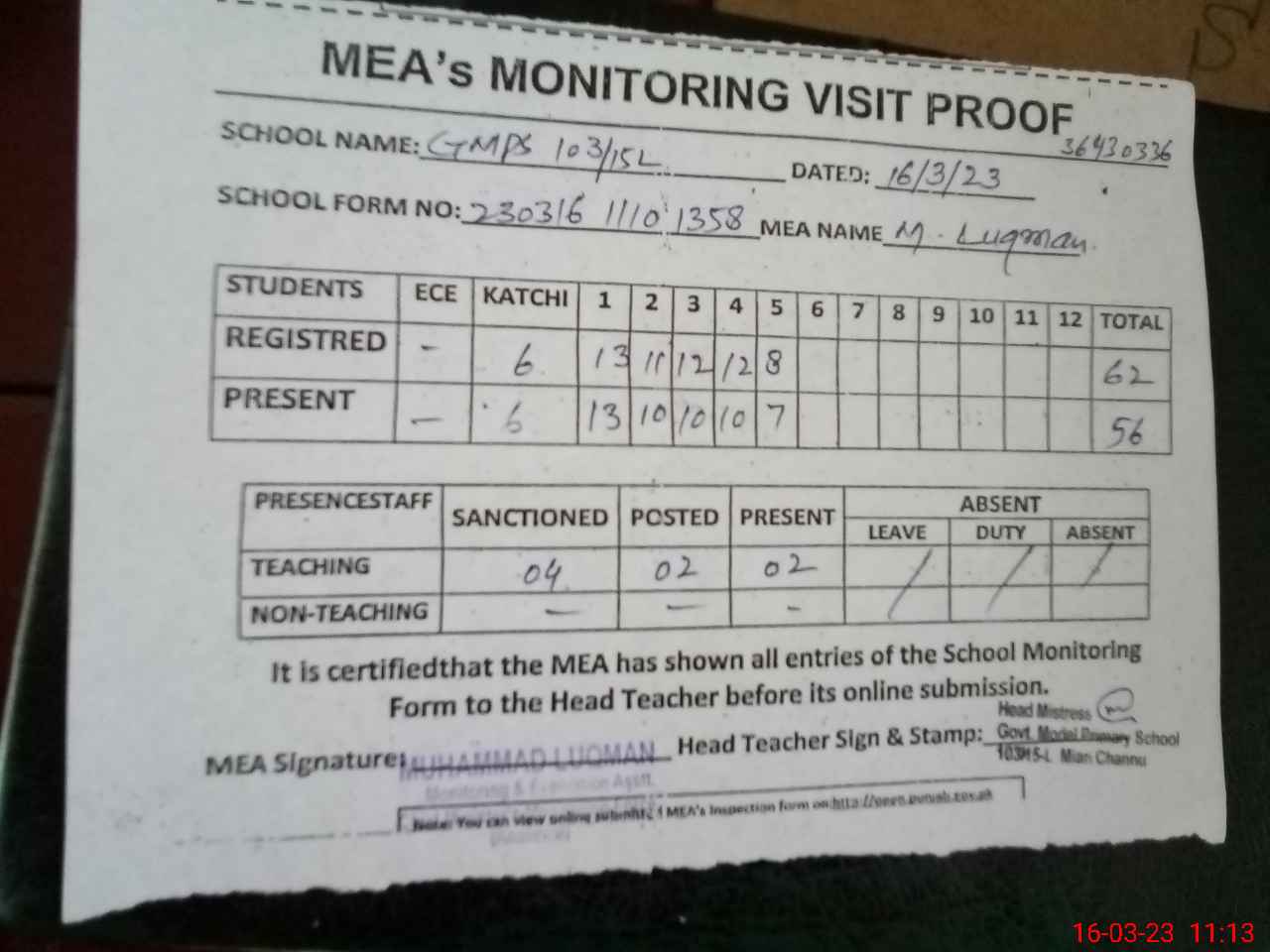 | EMIS Code: 36430336 | Name of School: GMPS 103/15-L, MIAN CHANNU | |||