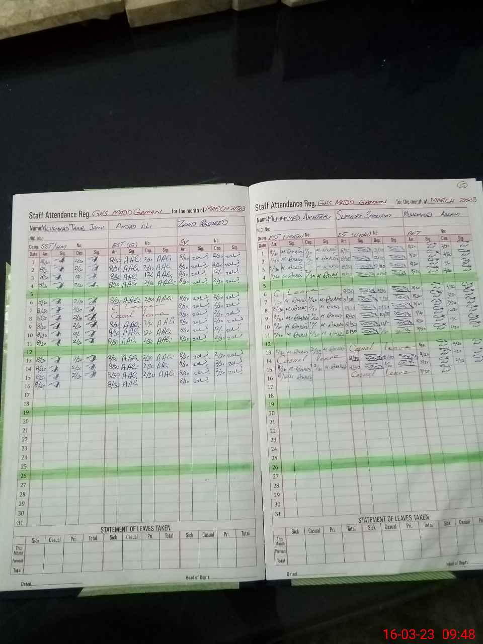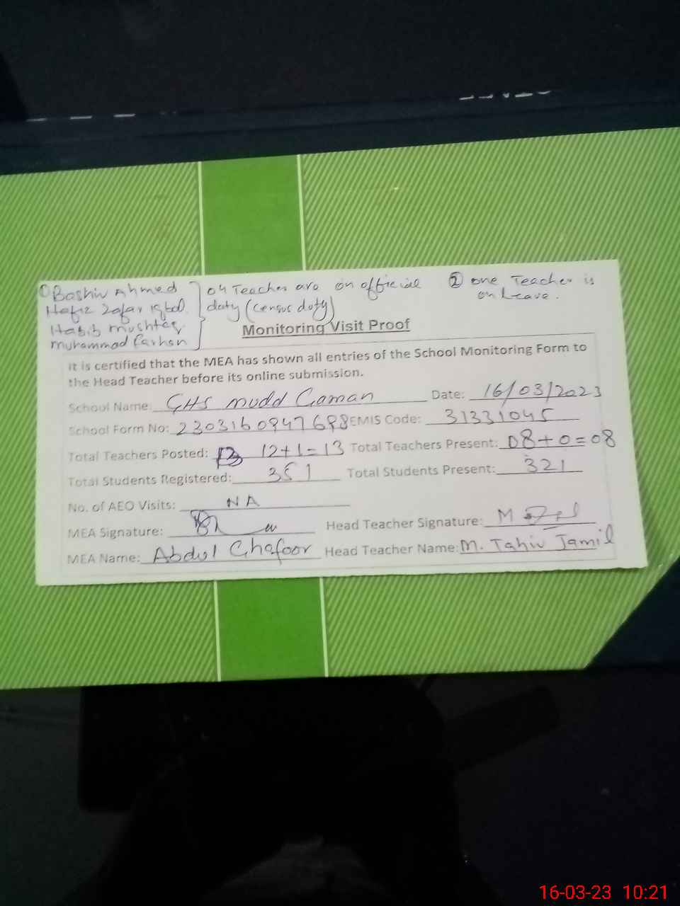 | Name: M.TA**** JA**** Designation: (School Headmaster's/Headmistress's) S.S.T.(general) Phone/Cell Number: 03**** |