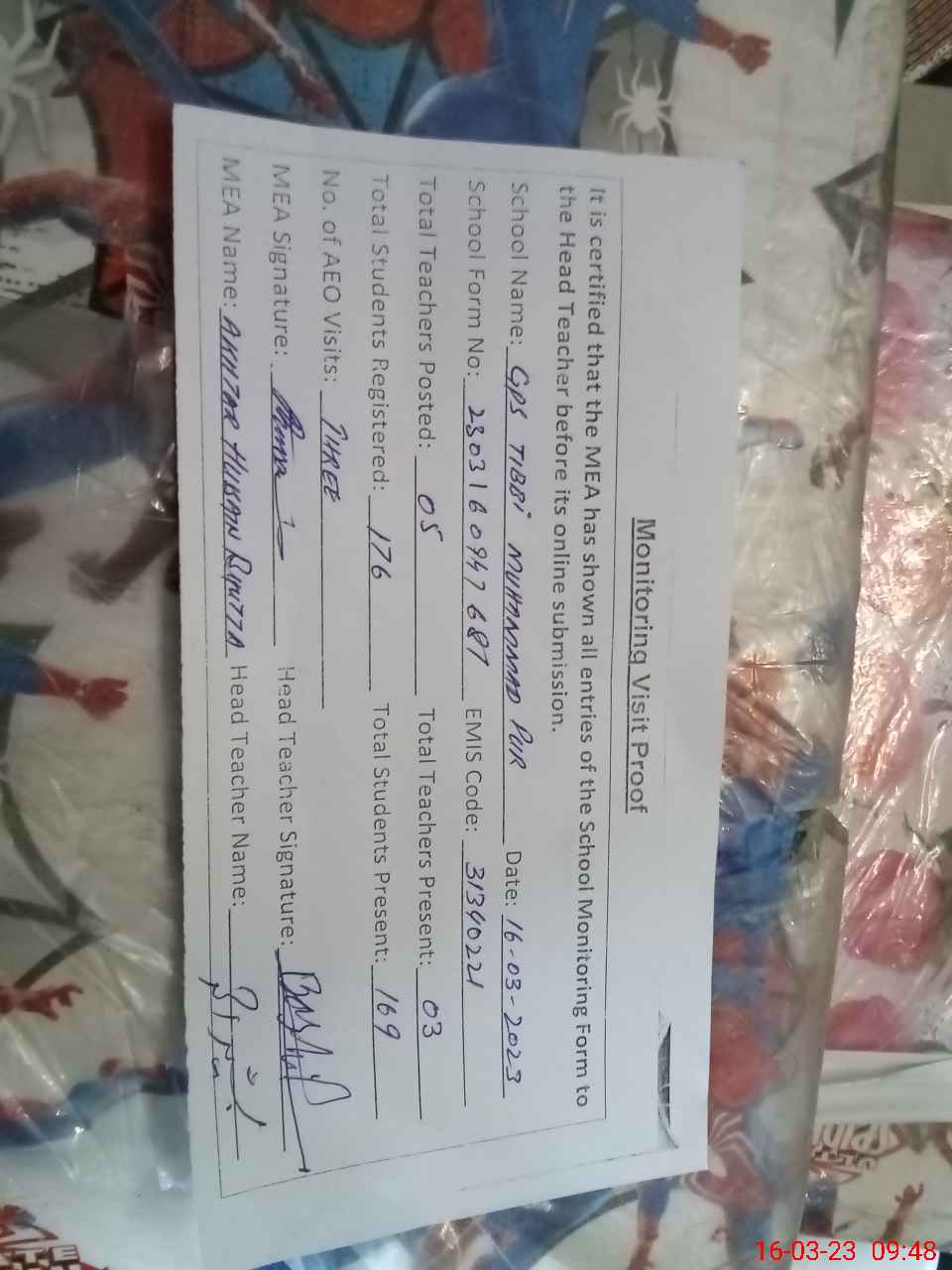 | Attendance Register | Head Teacher | MEA with School | Visit Proof |