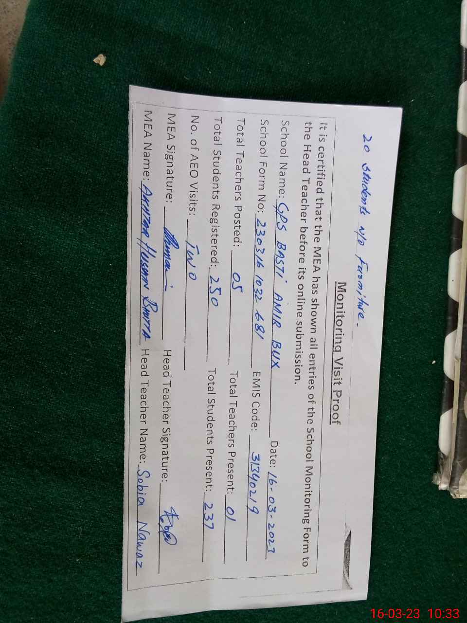| EMIS Code: 31340219 | Name of School: GPS BASTI AMIR BUX | |||