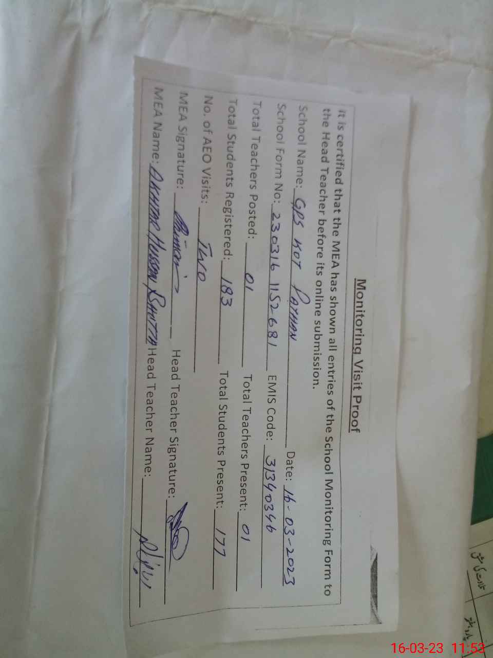 | Attendance Register | Head Teacher | MEA with School | Visit Proof |