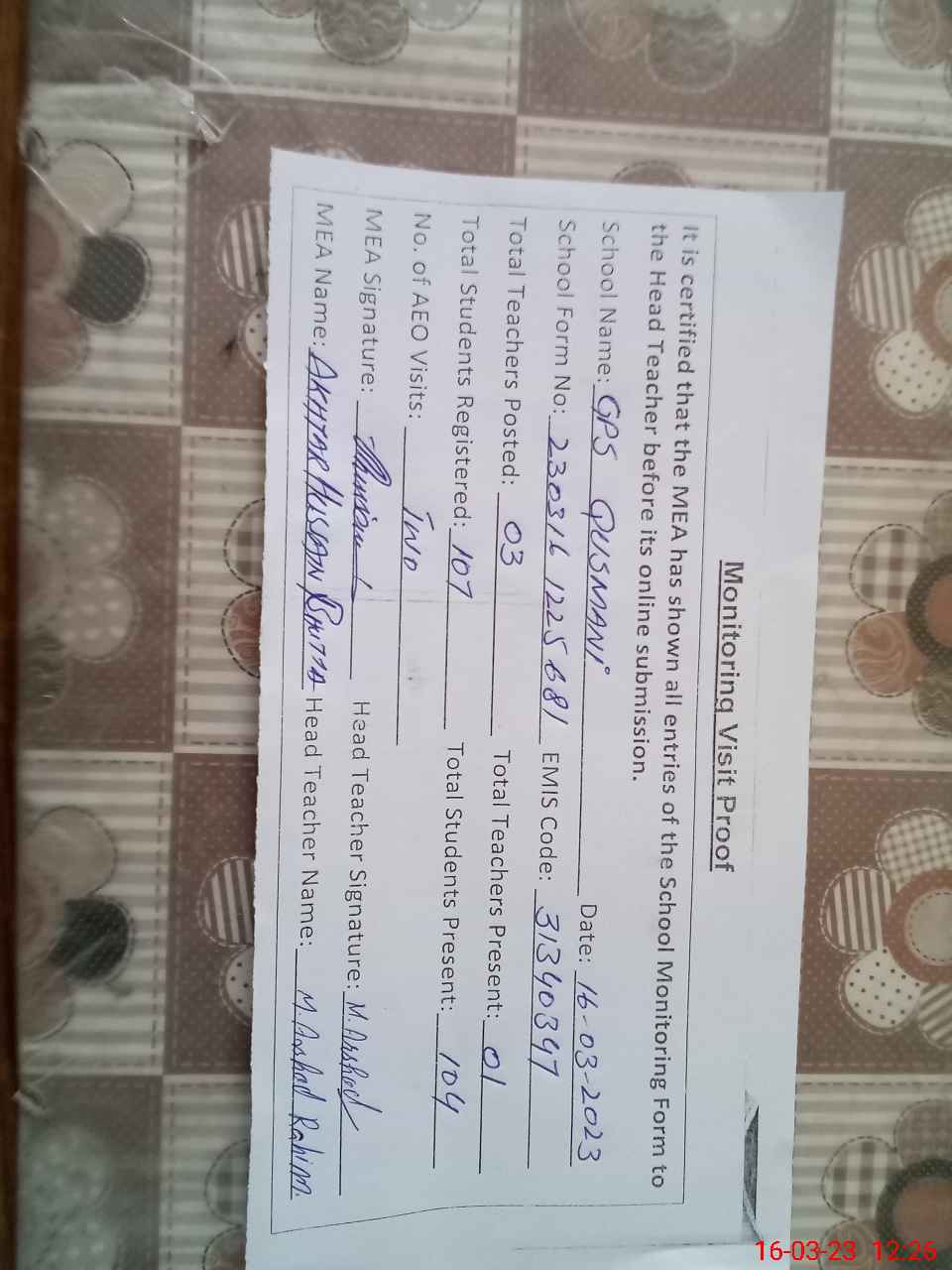 | Attendance Register | Head Teacher | MEA with School | Visit Proof |
