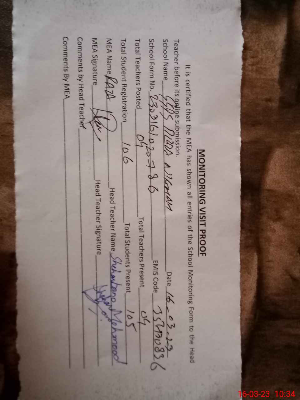 | Attendance Register | Head Teacher | MEA with School | Visit Proof |