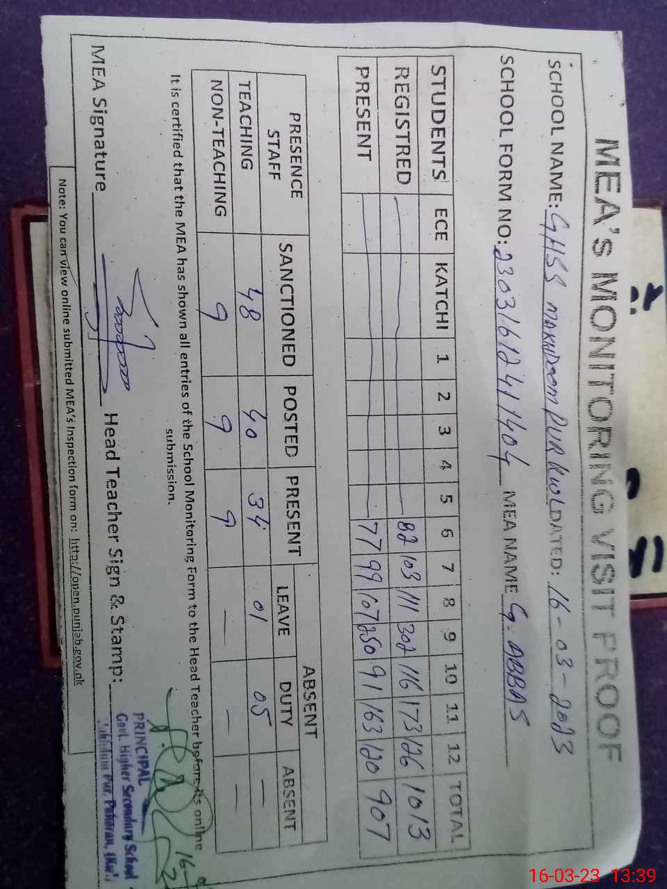 | Attendance Register | Head Teacher | MEA with School | Visit Proof |