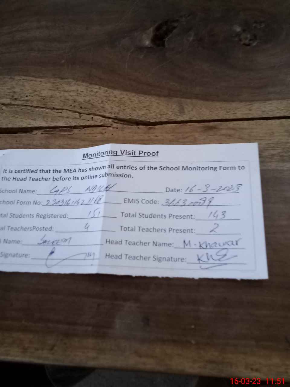 | Attendance Register | Head Teacher | MEA with School | Visit Proof |