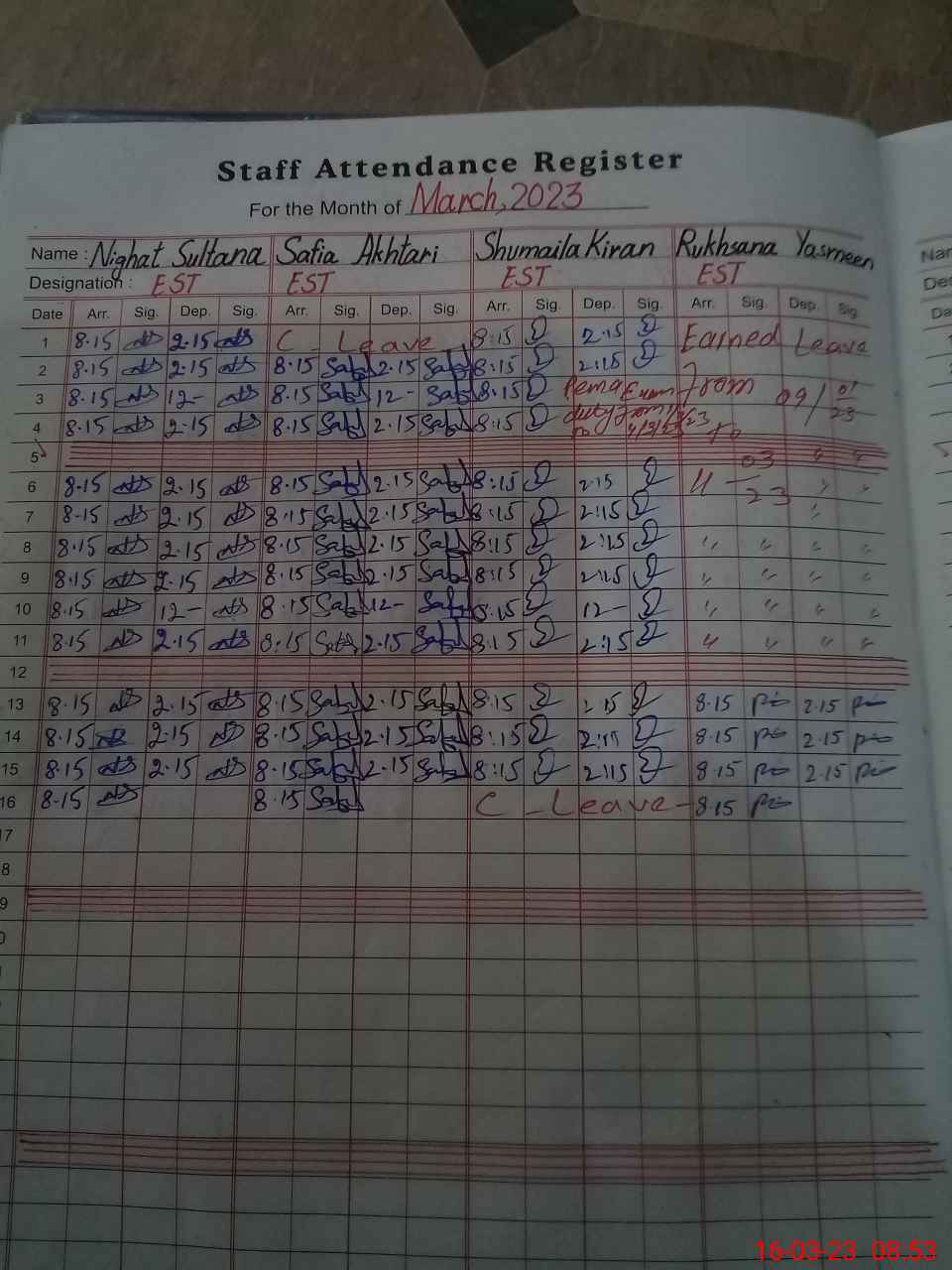 | No. of Students Present - Female | 10 | 0 | 111 | 68 | 81 | 62 | 64 | 68 | 91 | 89 | 73 | 67 | 67 | 851 | ||