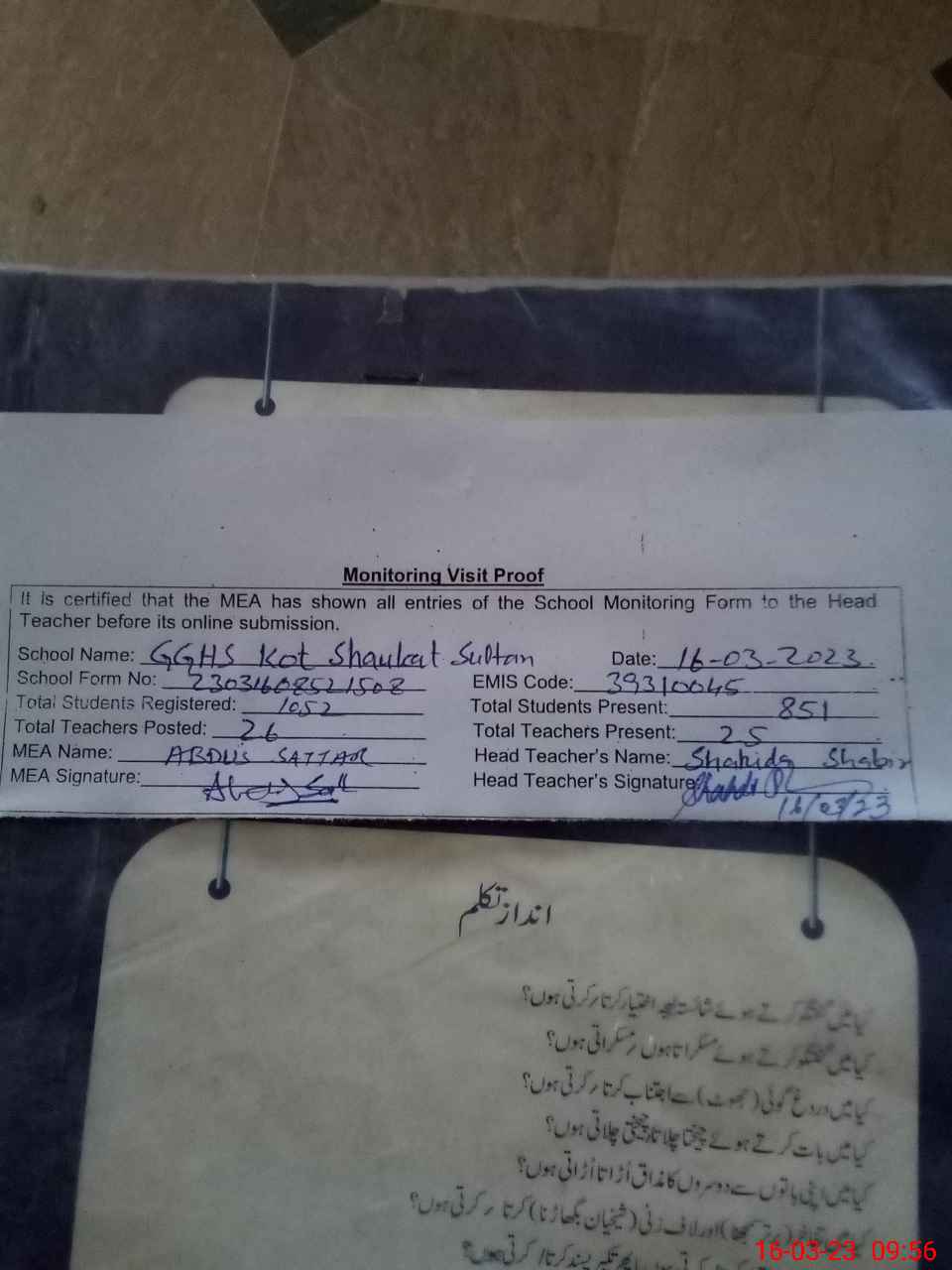 | EMIS Code: 39310045 | Name of School: GGHS KOT SHOUKAT SULTAN | |||