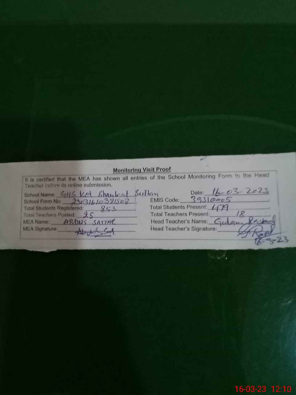 | EMIS Code: 39310005 | Name of School: GHS KOT SHAUKAT SULTAN | |||