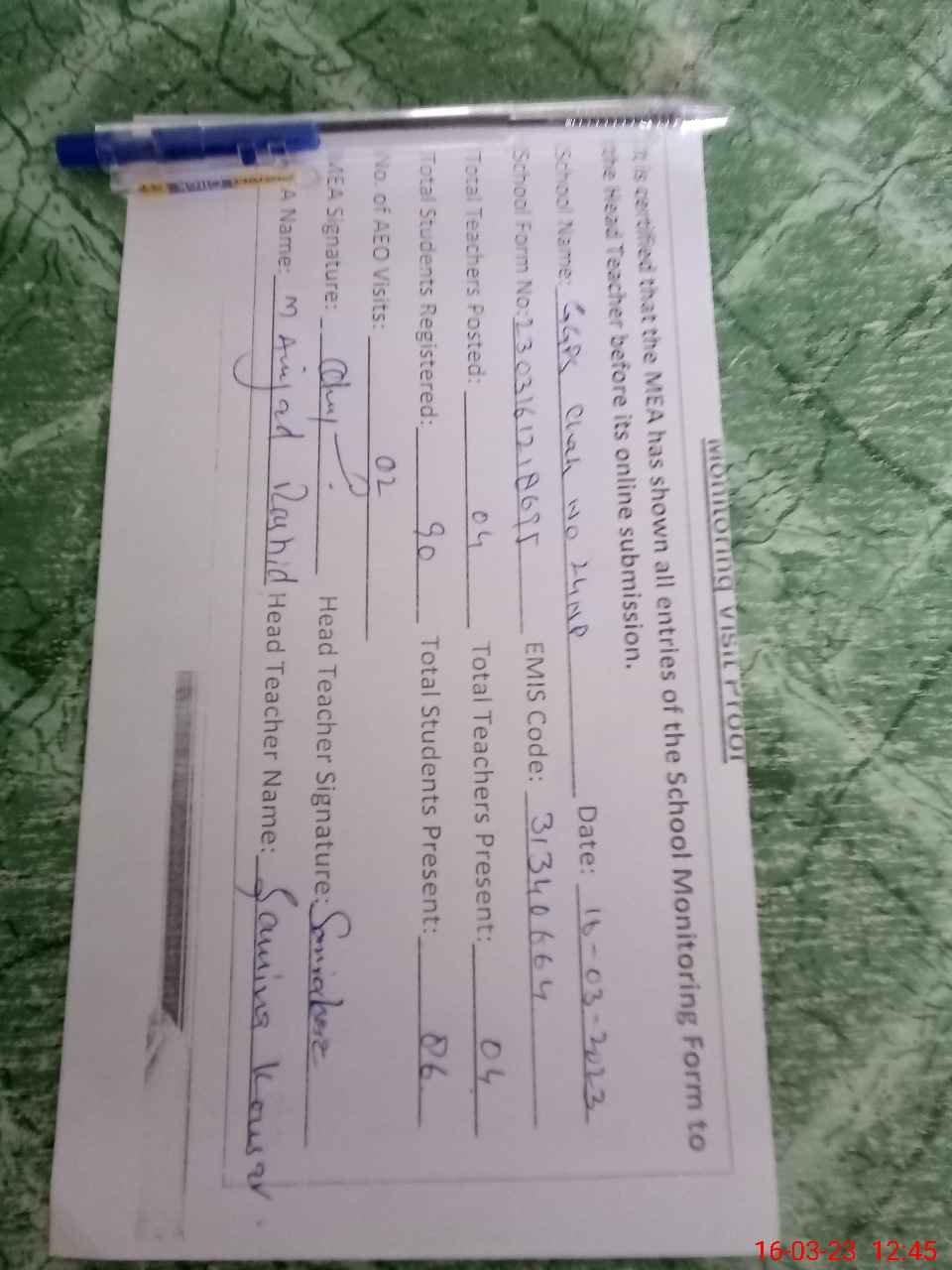 | Attendance Register | Head Teacher | MEA with School | Visit Proof |