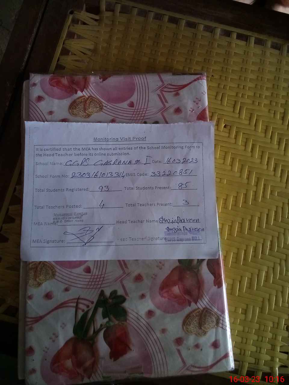 | Certified that this School was Inspected by the Undersigned MEA/DMO Today and the Information Stated Above is as Per Record. | |||||
