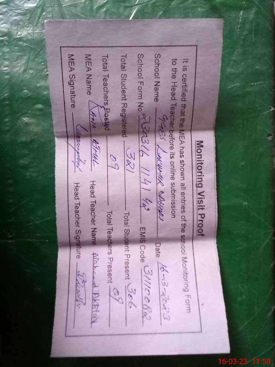| Attendance Register | Head Teacher | MEA with School | Visit Proof |