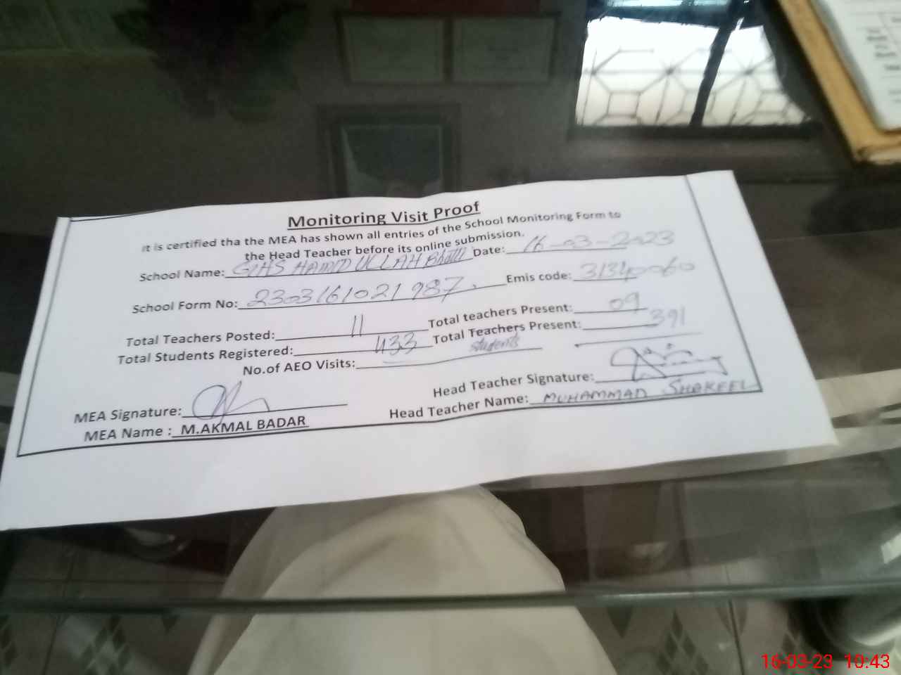 | Attendance Register | Head Teacher | MEA with School | Visit Proof |