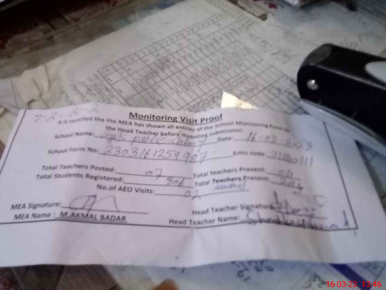 | Attendance Register | Head Teacher | MEA with School | Visit Proof |