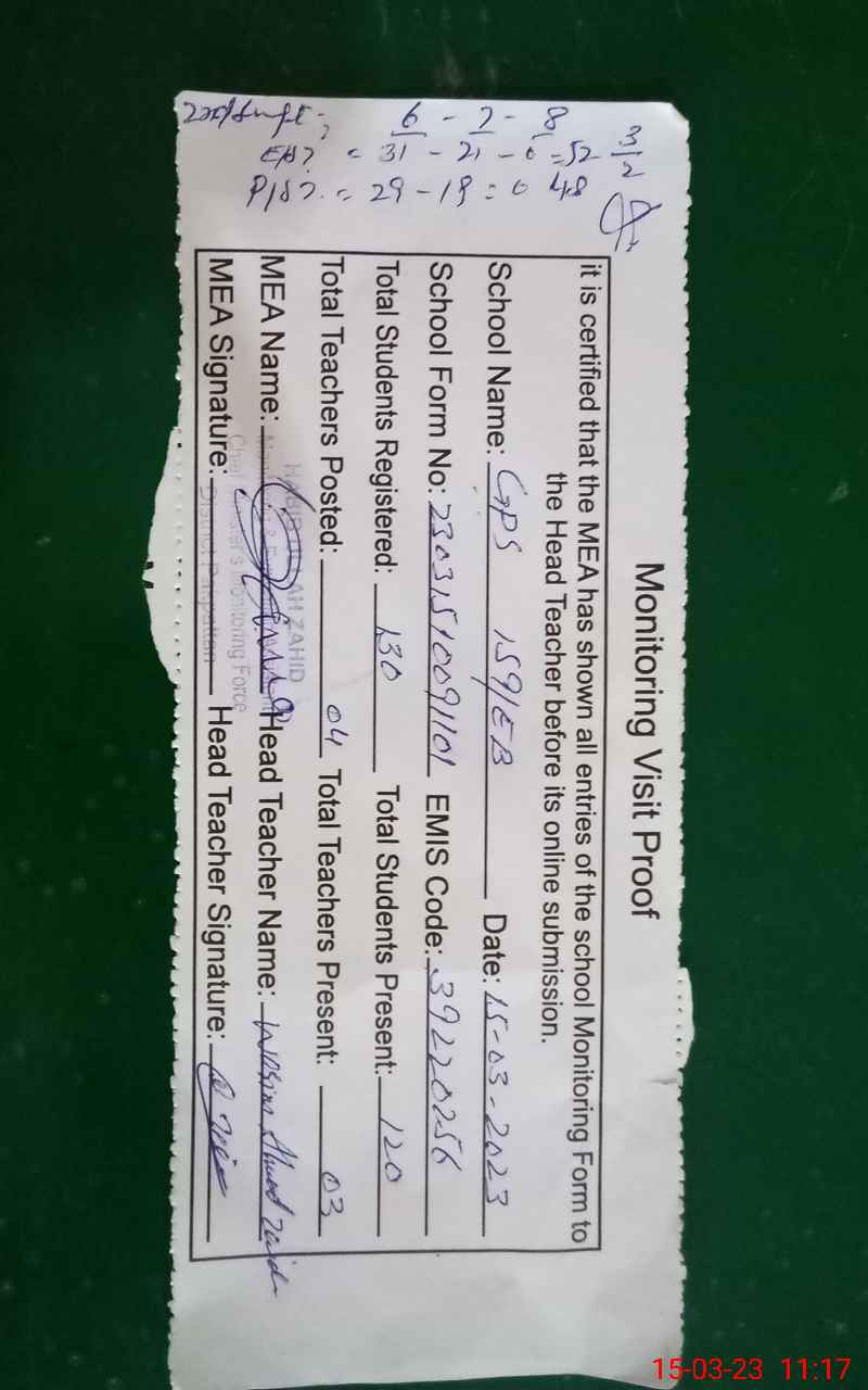 | EMIS Code: 39220256 | Name of School: GPS 159 EB P.O ARIF WALA | |||