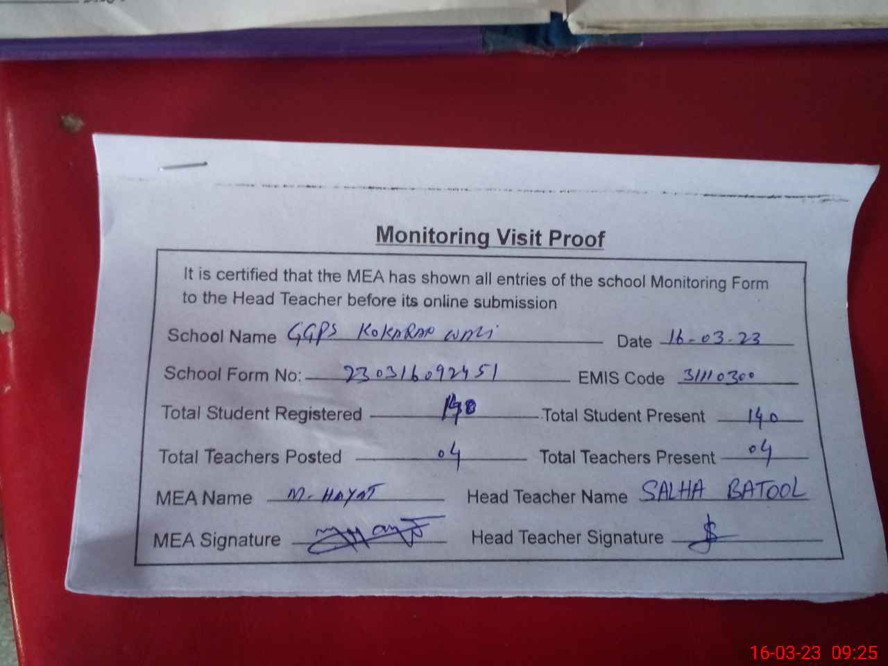 | EMIS Code: 31110300 | Name of School: GGPS KOKARAN WALI | |||