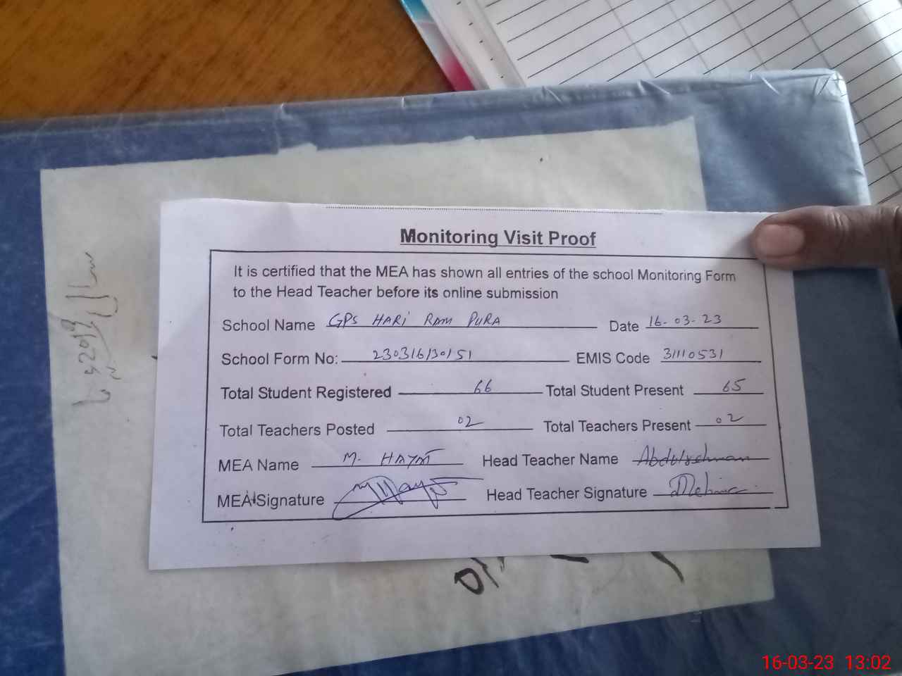 | Attendance Register | Head Teacher | MEA with School | Visit Proof |