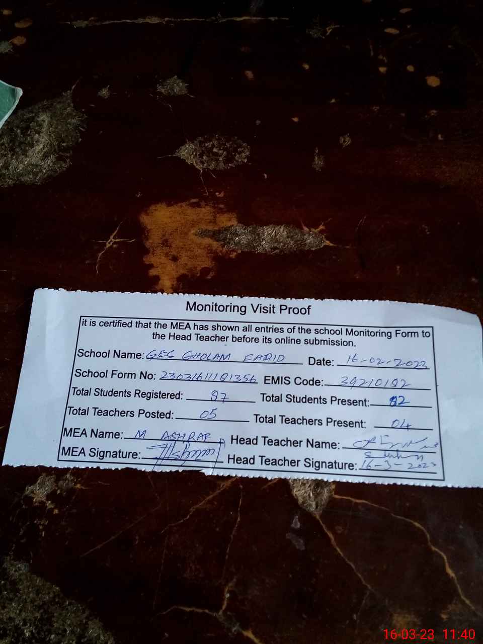 | EMIS Code: 39210182 | Name of School: GES BASTI GHULAM FARID | |||