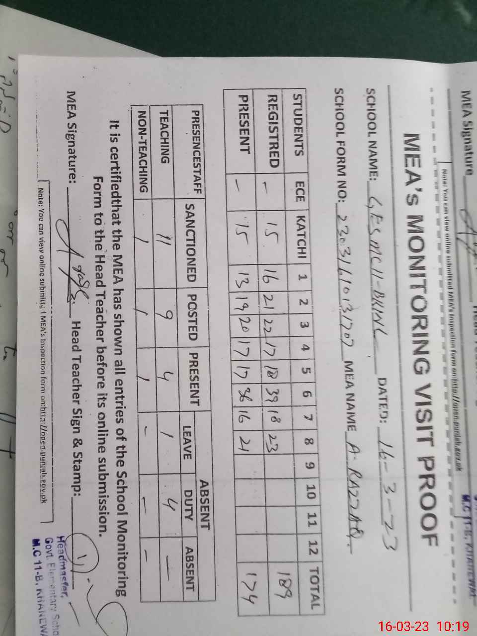 | Attendance Register | Head Teacher | MEA with School | Visit Proof |