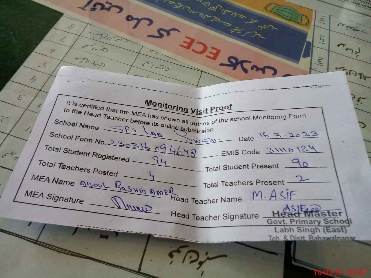 | Attendance Register | Head Teacher | MEA with School | Visit Proof |