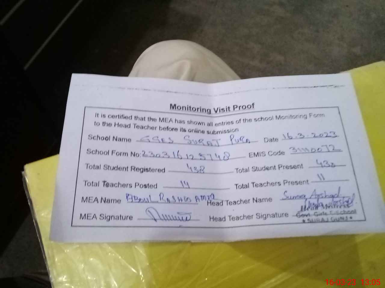 | Attendance Register | Head Teacher | MEA with School | Visit Proof |