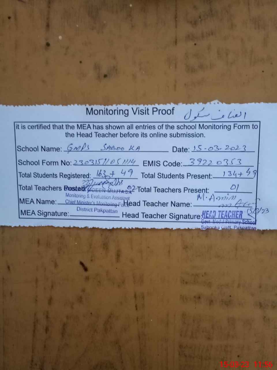 | EMIS Code: 39220353 | Name of School: GMPS SABOOKA DAKHANA TIBI LAL BAIG | |||