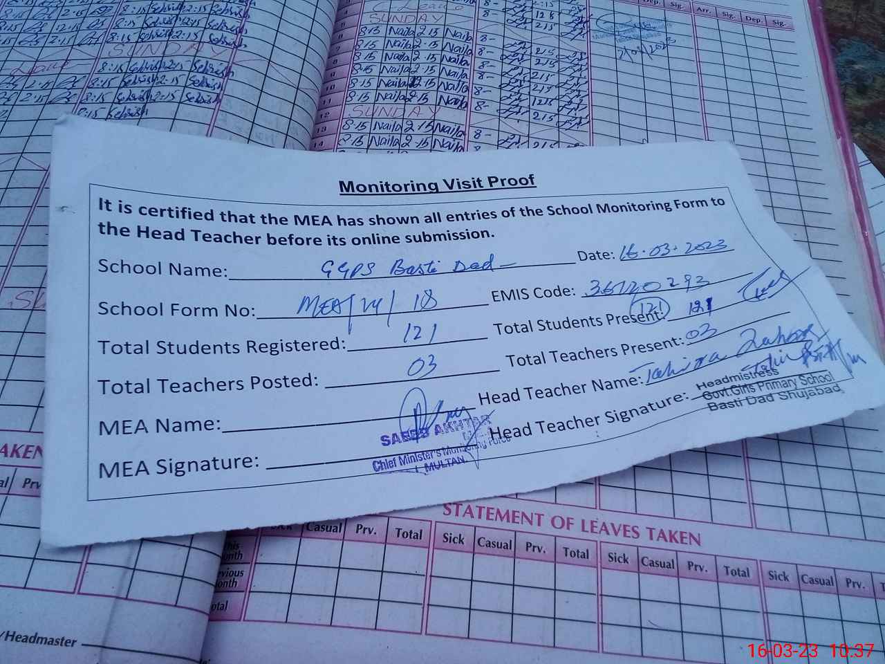 | EMIS Code: 36120293 | Name of School: GGPS BASTI DAD SHUJABAD MULTAN | |||