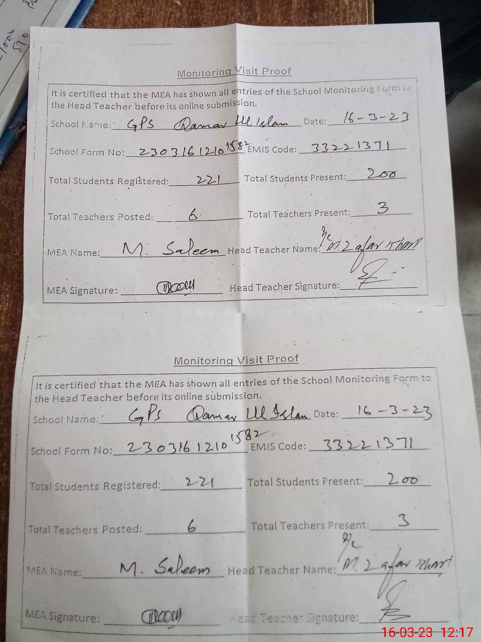 | Attendance Register | Head Teacher | MEA with School | Visit Proof |