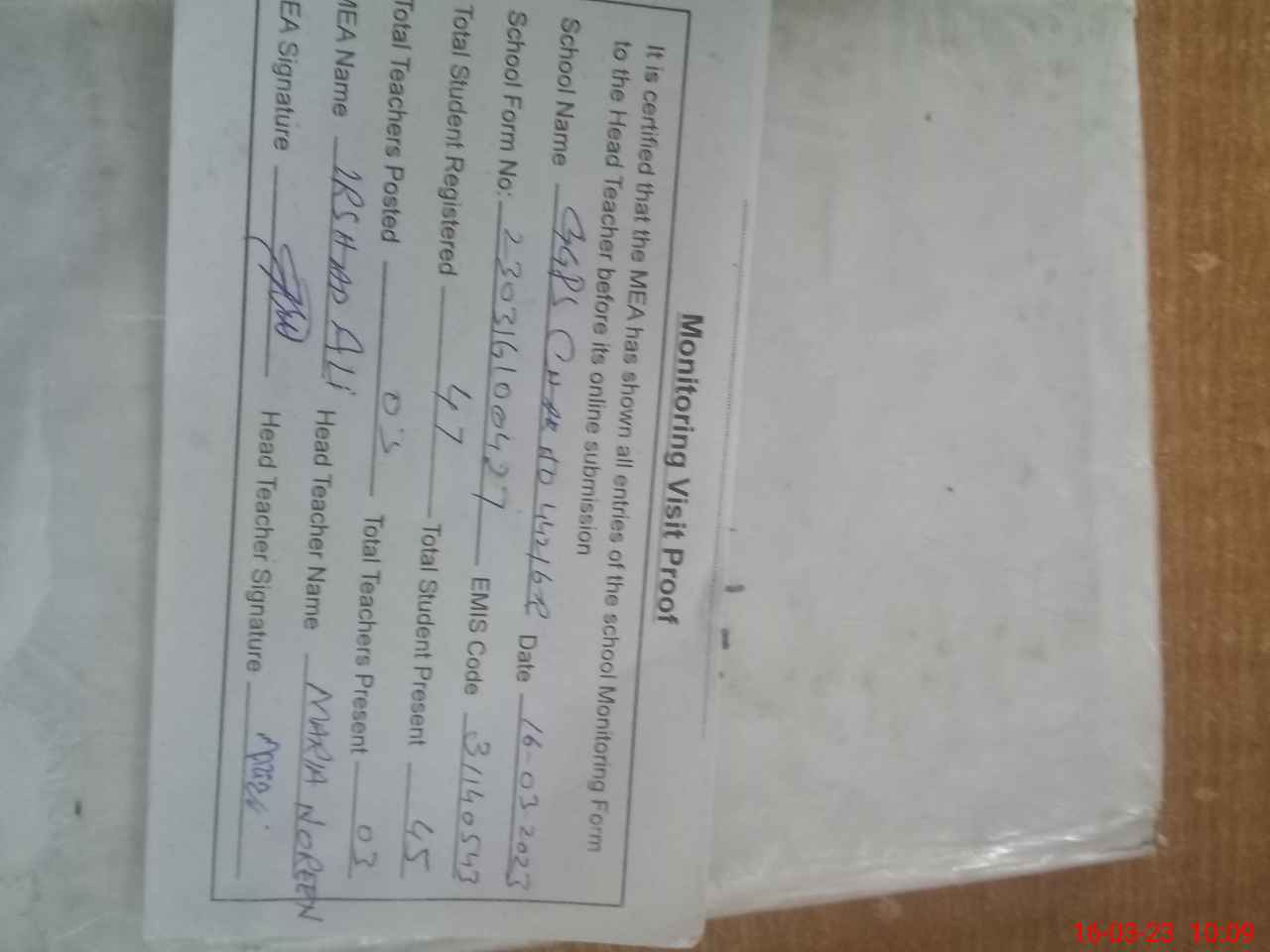 | Attendance Register | Head Teacher | MEA with School | Visit Proof |