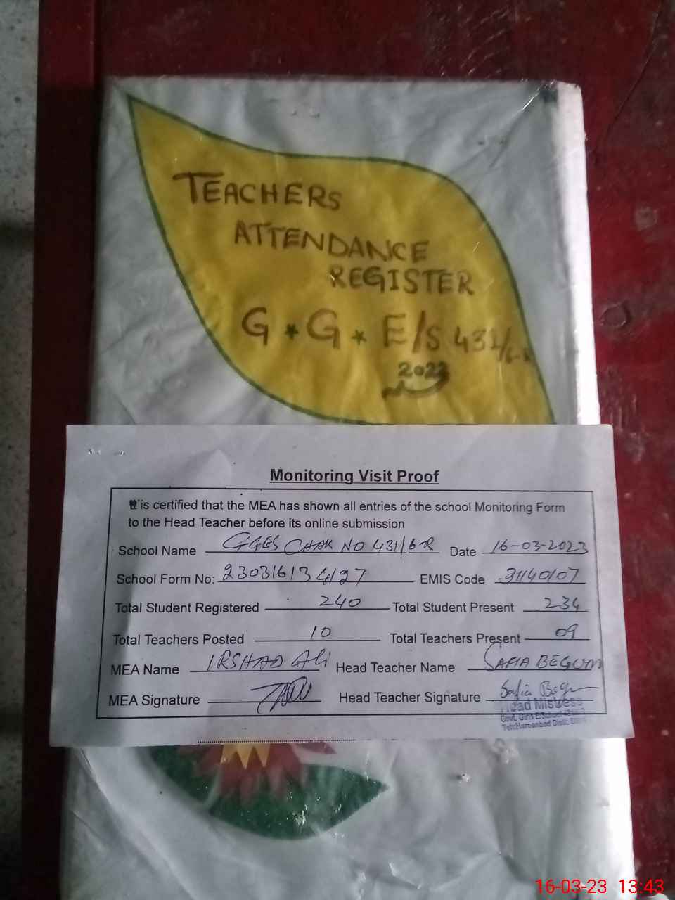 | Attendance Register | Head Teacher | MEA with School | Visit Proof |