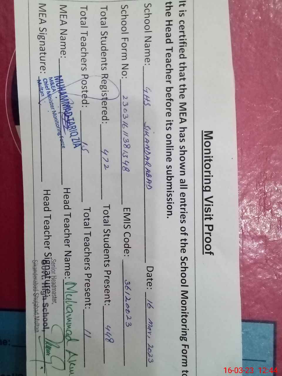 | Attendance Register | Head Teacher | MEA with School | Visit Proof |