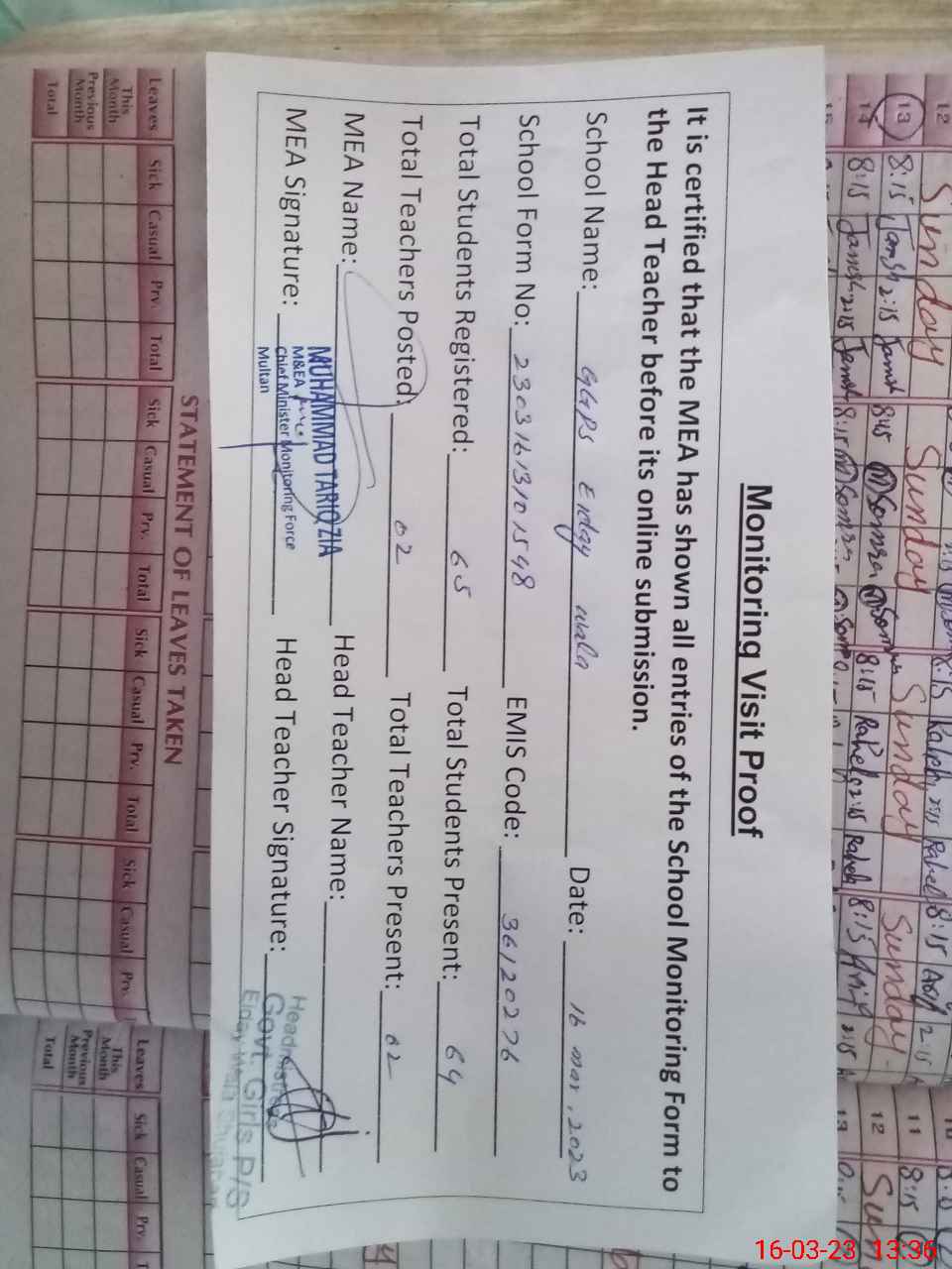 | Attendance Register | Head Teacher | MEA with School | Visit Proof |