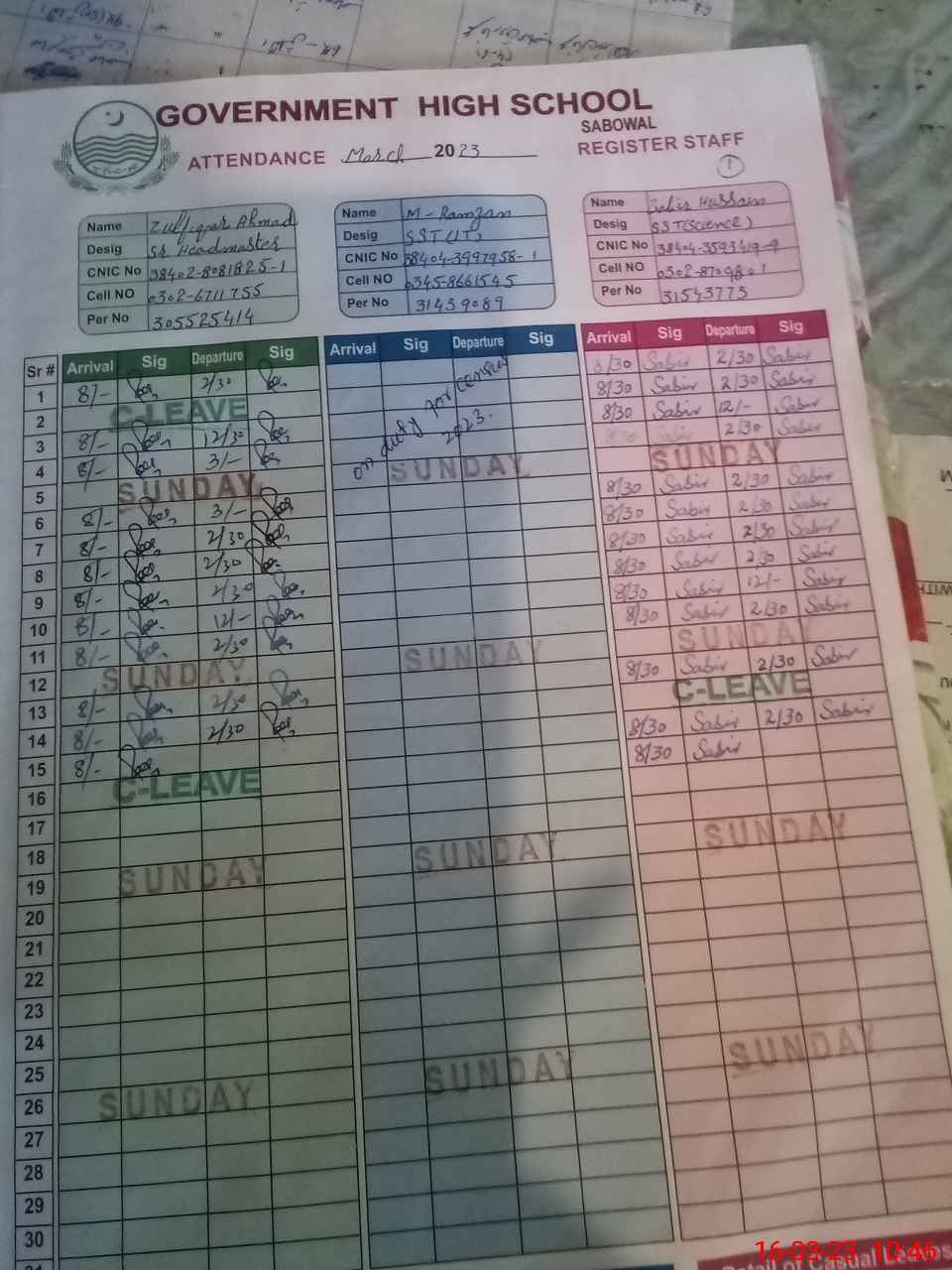 | CNIC | Full Name | Designation | R/C | Absence during last cal. month |