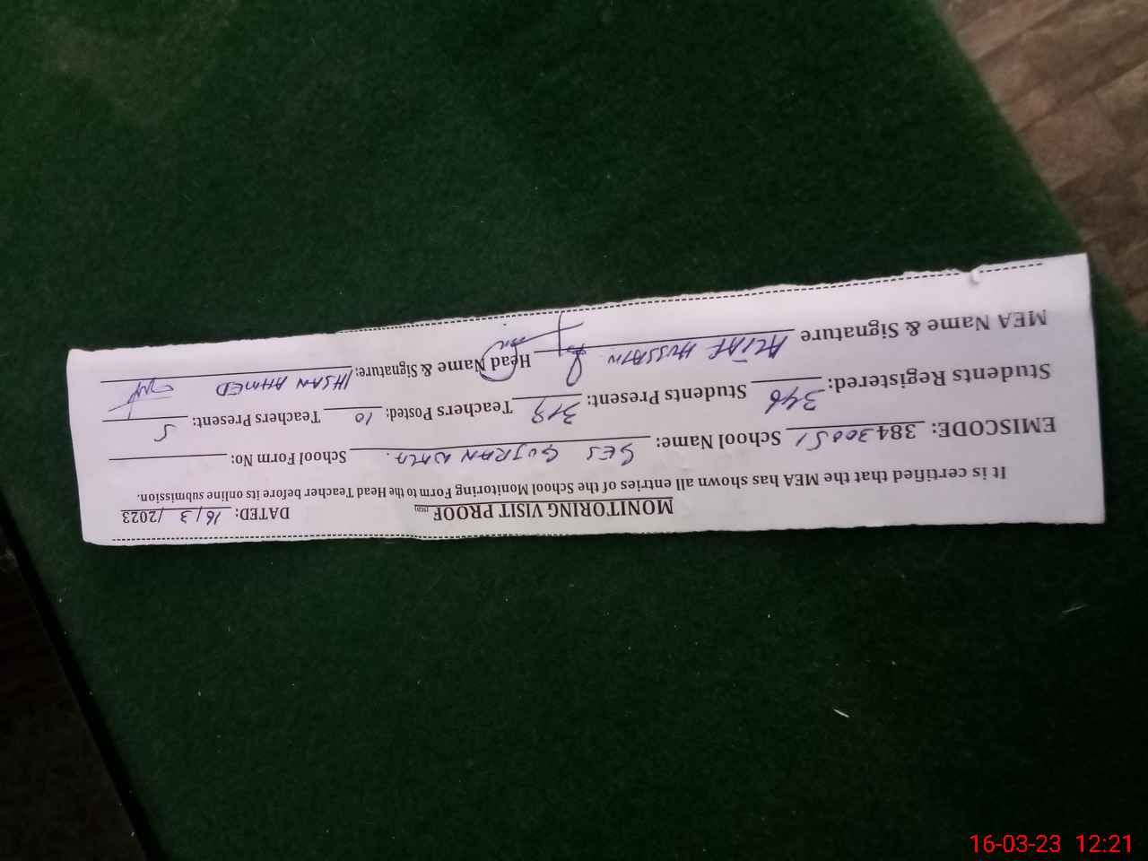 | Name: TA**** IQ**** Designation: (School Headmaster's/Headmistress's) S.S.T.(Phy) Phone/Cell Number: 03**** |