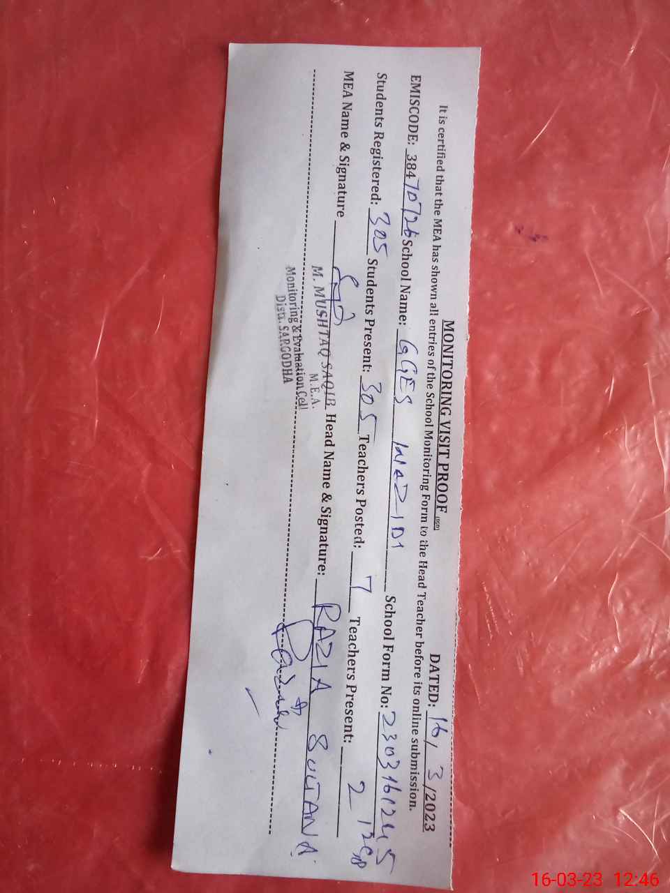 | Certified that this School was Inspected by the Undersigned MEA/DMO Today and the Information Stated Above is as Per Record. | |||||