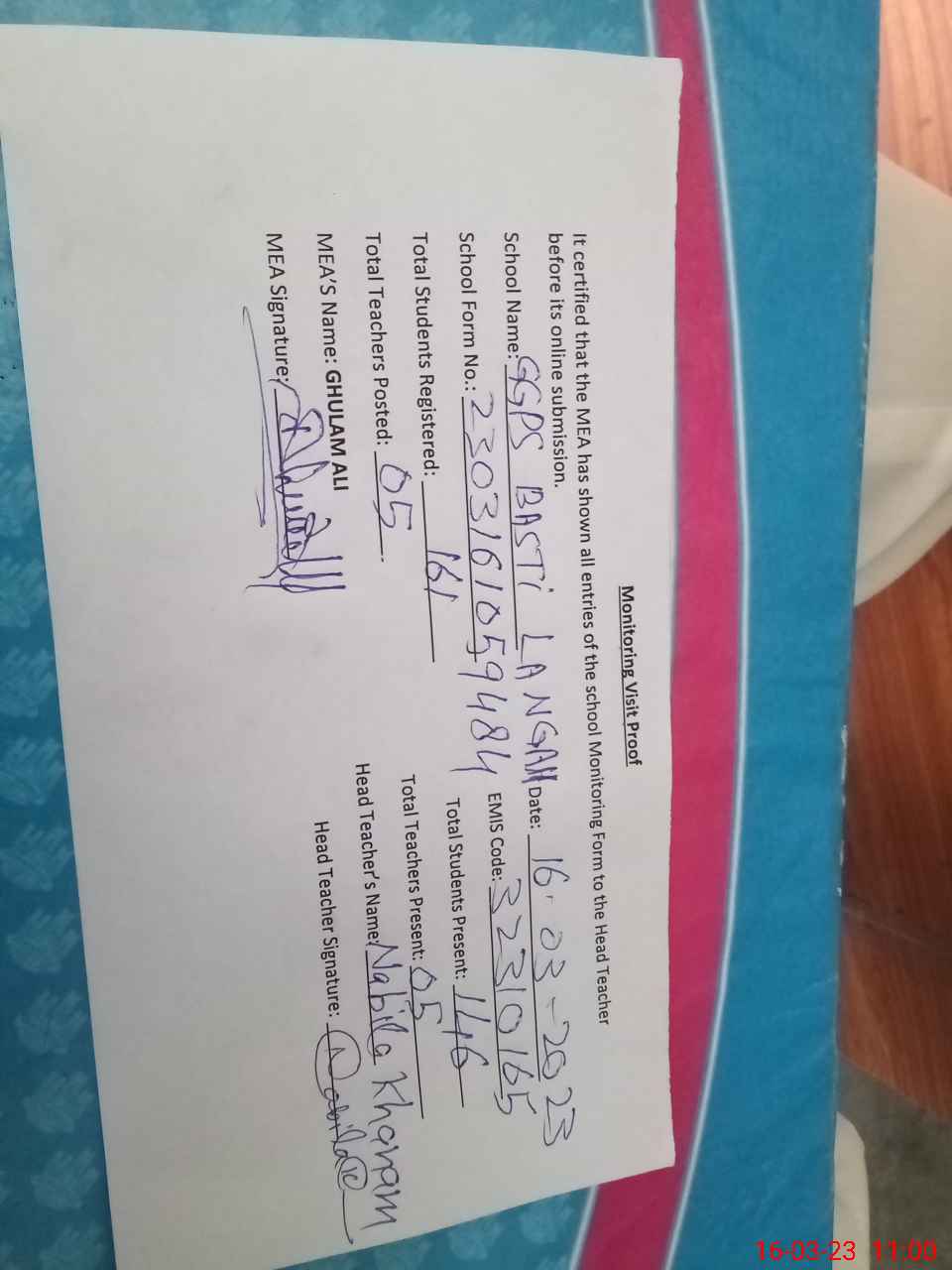 | Attendance Register | Head Teacher | MEA with School | Visit Proof |