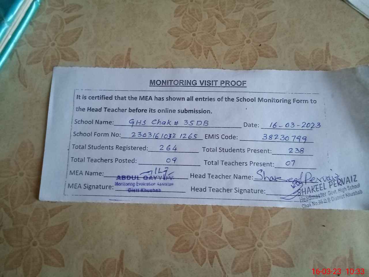 | EMIS Code: 38230799 | Name of School: GHS CHAK NO 35 DB | |||
