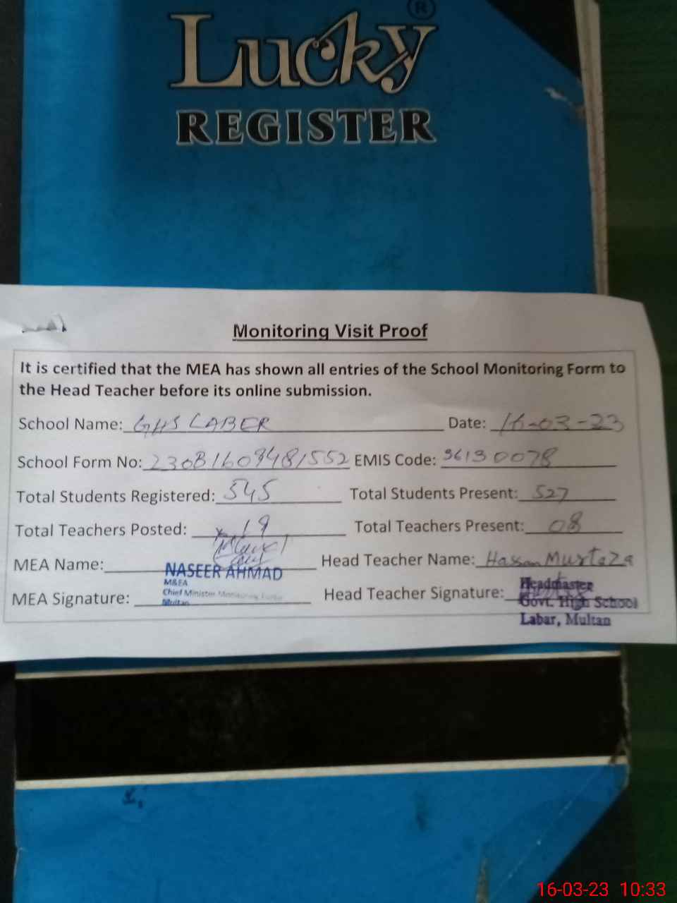 | Name: HA**** MU**** Designation: (School Headmaster's/Headmistress's) Incharge Headmaster SST GEN Phone/Cell Number: 03**** |