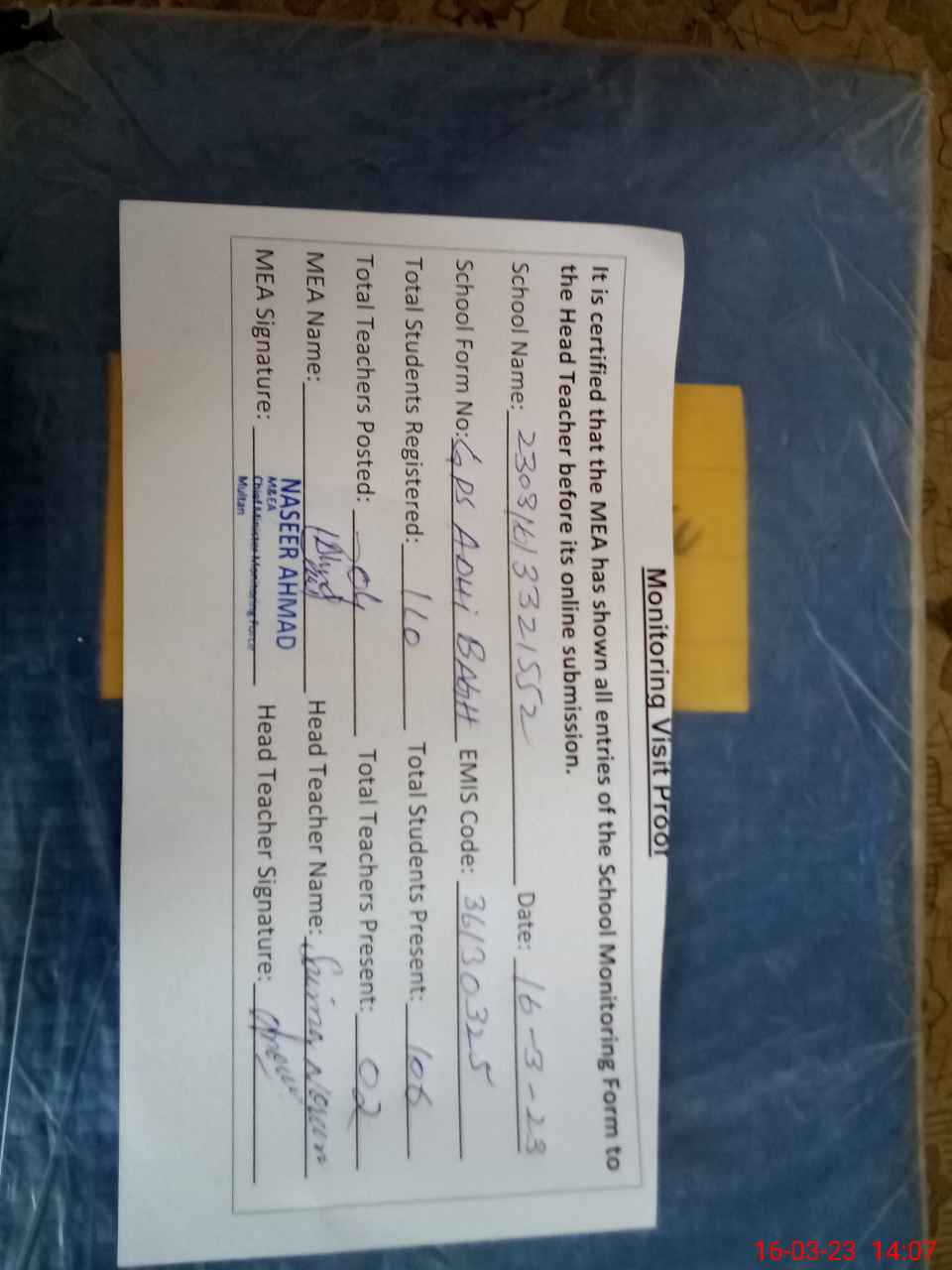 | Attendance Register | Head Teacher | MEA with School | Visit Proof |