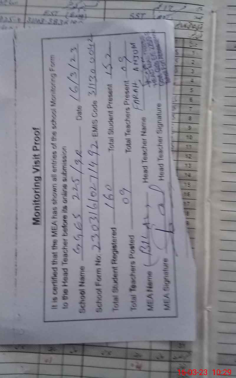| Attendance Register | Head Teacher | MEA with School | Visit Proof |