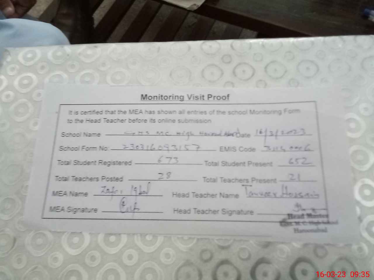 | Certified that this School was Inspected by the Undersigned MEA/DMO Today and the Information Stated Above is as Per Record. | |||||