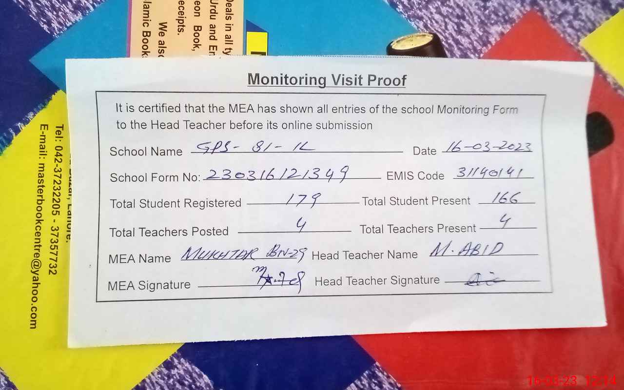 | Attendance Register | Head Teacher | MEA with School | Visit Proof |