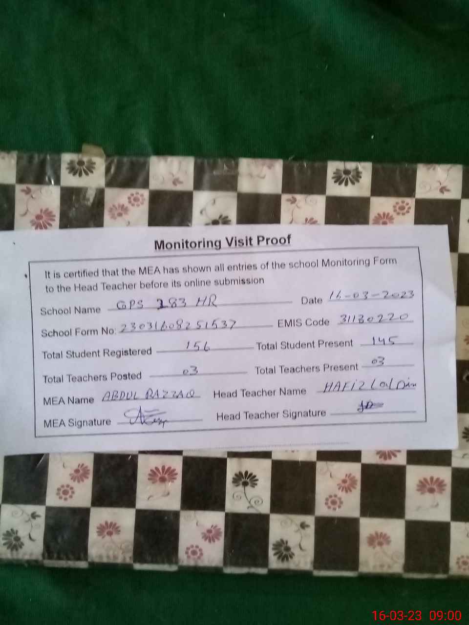 | Attendance Register | Head Teacher | MEA with School | Visit Proof |